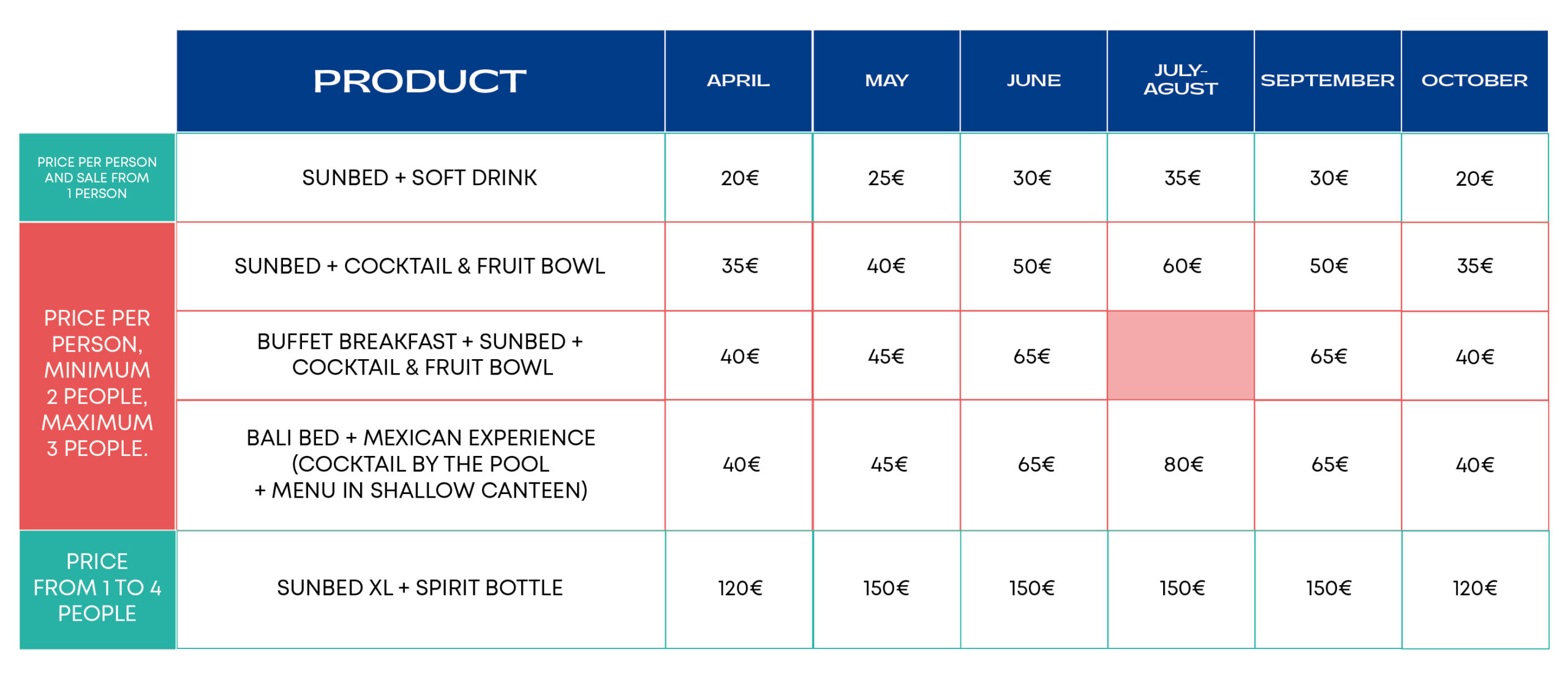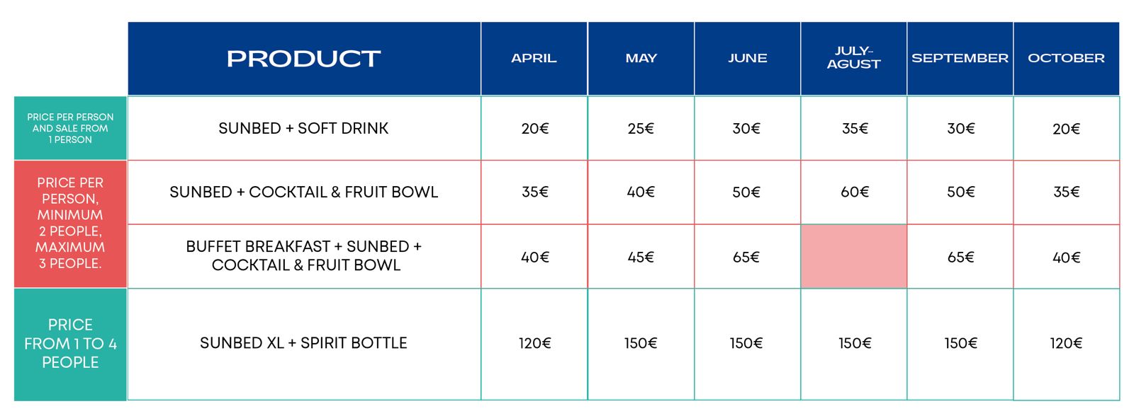*Prices may vary during the season. You can check the full price list here.